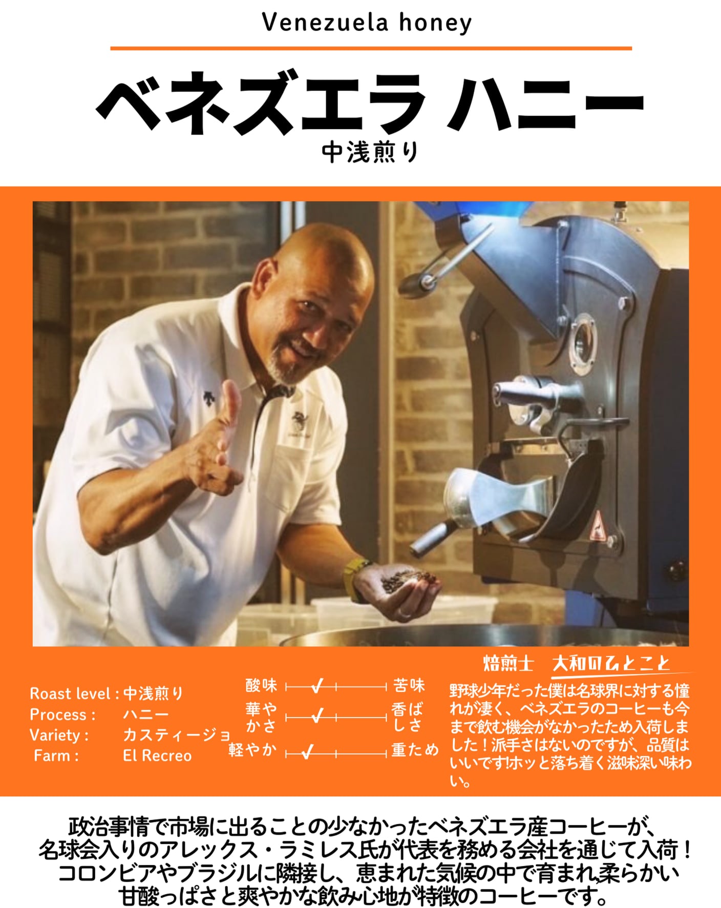 政治事情で市場に出ることの少なかったベネズエラ産コーヒーが、名球会入りのアレックス・ラミレス氏が代表を務める会社を通じて入荷!