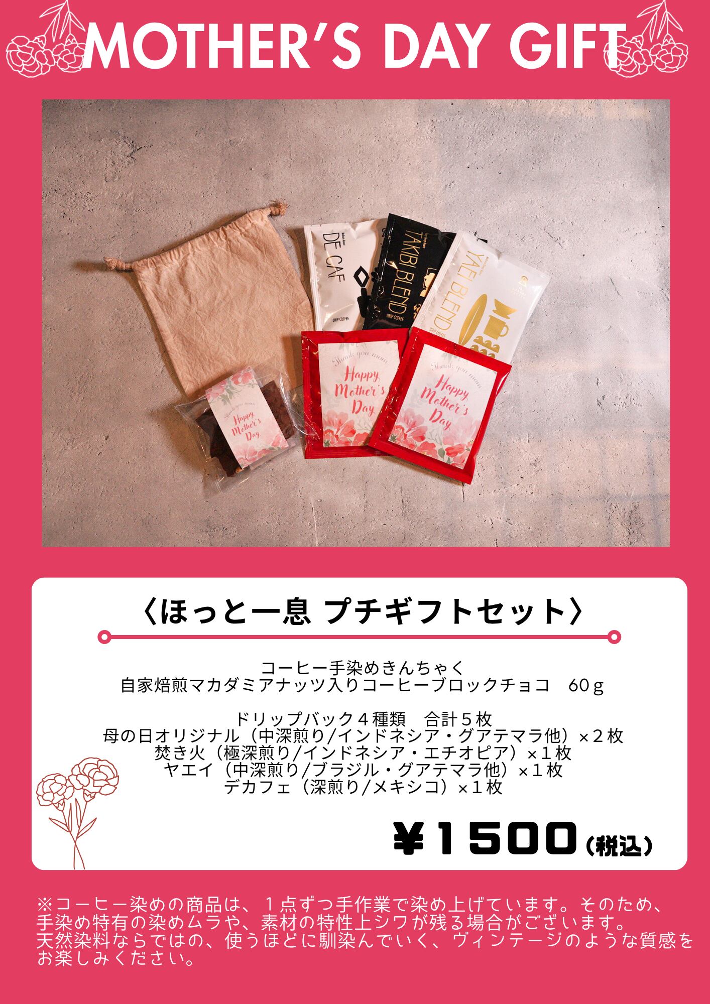 一点ずつ手作業で染めたコーヒー染めきんちゃくと、自家焙煎マカダミアナッツ入りコーヒーブロックチョコ、種類豊富なドリップバックを詰め合わせました。忙しい毎日の合間に、ほっとひといきな時間を。そんな思いを込めたセットです。