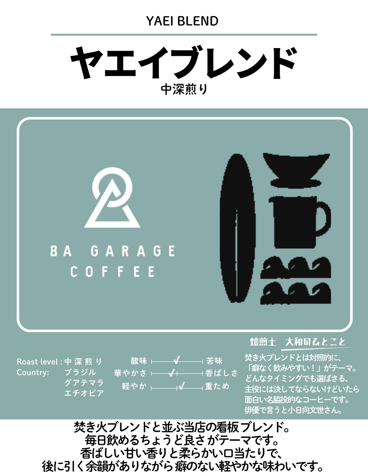 2種類のマンデリンを使い、深いコクと苦味が特徴。終わりにエチオピアがふわっと甘く香ります。