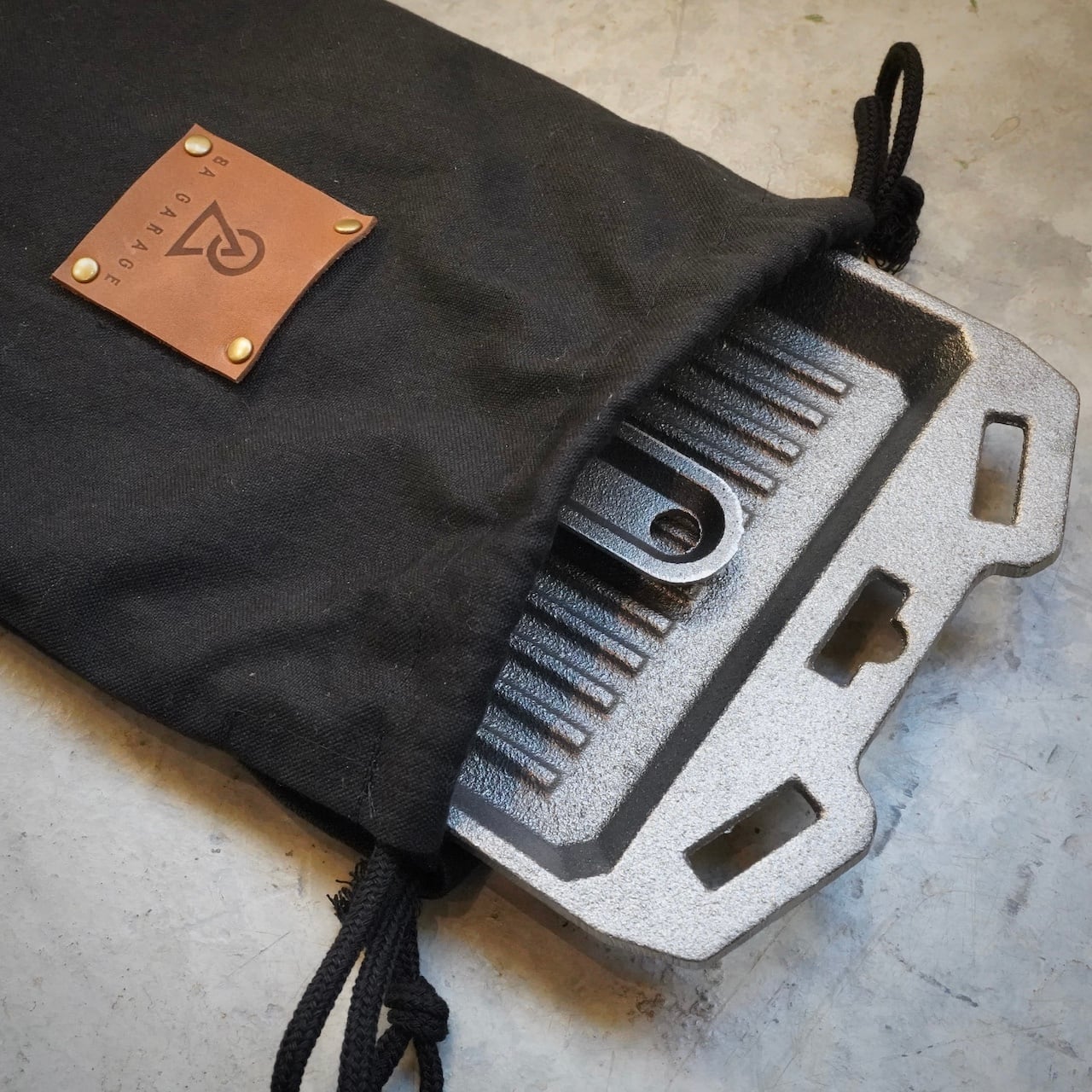 重い鋳鉄製のプレートをしっかり保護できるよう、厚手の帆布を使用。内部にはプレートの取っ手が収まるポケットがあり、持ち運び時に取っ手が暴れてカチャカチャ音がなったり、破損する心配がありません。