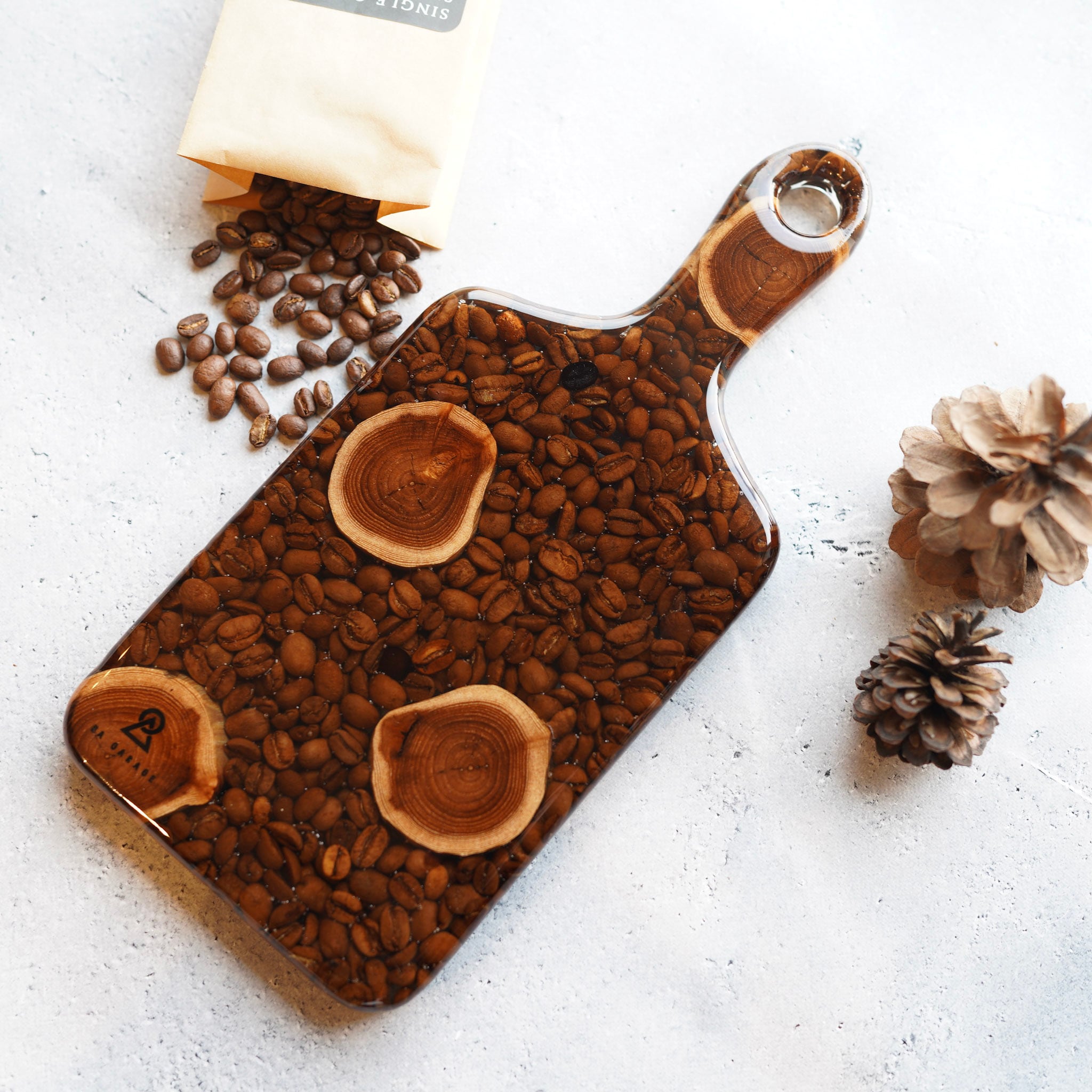 レジン部分にコーヒー豆を織り交ぜ、北海道の天然木と融合させたカッティングボードです。